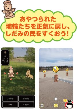 古墳マップで「教えてしだみこちゃん」ボタンをタップまたは、しだみクエストで「教えてしだみこちゃん」ボタンをタップすれば、しだみこちゃんが「歴史の里」を案内してくれるよ