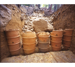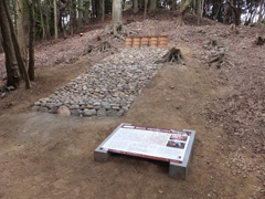 後円部北側は、東谷山山頂からのびる尾根を切断して、古墳の形をつくっています。東谷山の麓から運んできた円礫を用いた葺石の上には石英が撒かれ、後円部頂部には石英が敷かれていたと推定されます。後円部北側では、4条の突帯(帯状突出した部分)がめぐり、各段に3個ずつ三角形の透孔があけられた円筒埴輪が極めて良好な状態で残っていました。中社古墳の円筒埴輪は、大王墓がつくられた奈良県東南部からの影響が色濃く、東海地方では最古級の円筒埴輪です。