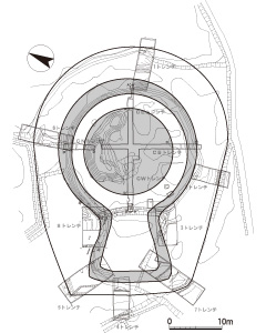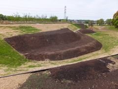 戦後の大久手池の拡張工事により、後円部の南側が削られています。後円部1段目の幅広の平坦面で、少し間隔をあけて並べられた埴輪列が見つかっています。