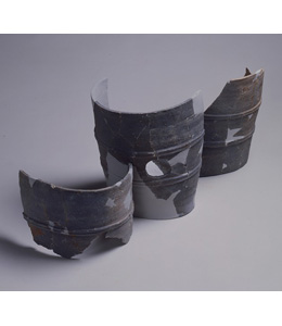 後円部1段目の平坦面ではすき間なく並べられた埴輪列が見つかりました。この場所は、円筒埴輪は突帯が2条めぐる3段構成のもので、須恵器と同じく灰褐色で硬く焼成されているものが目立ちます。