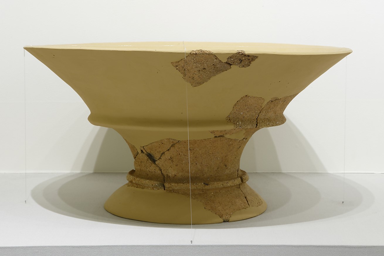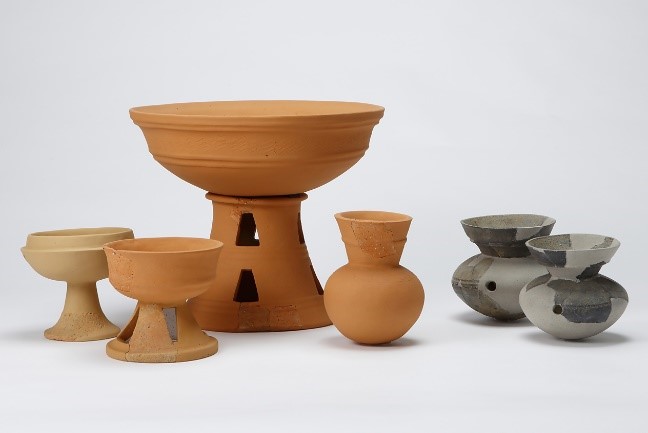 志段味大塚古墳の造り出しに置かれた祭祀用の土器です。灰色をした須恵器の𤭯(はそう)は、水やお酒を入れる器です。竹を小さな穴にさして、注ぎ口にしました。