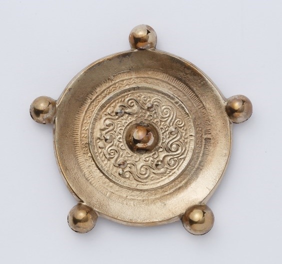 まわりに鈴がついた鏡です。鈴のなかには石の丸(がん)が入っています。志段味大塚古墳の鈴鏡は、王を埋葬する儀式で使われたのかもしれません。